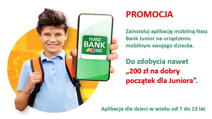 Zainstaluj aplikację mobilną Nasz Bank Junior na urządzeniu mobilnym swojego dziecka. Do zdobycia nawet „200 zł na dobry początek dla Juniora”.